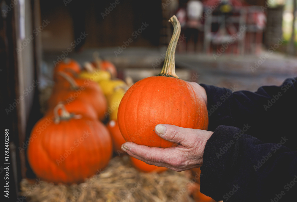 Close up of senior woman holding organic pumpkin at outdoor market - Autumn season, vegetable and small business concept #1782402386