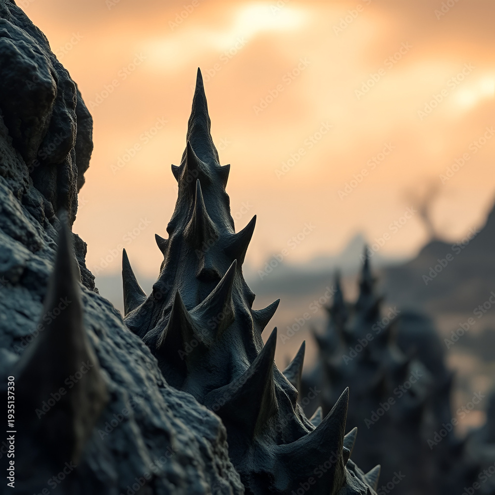 Close-up of sharp, jagged spiky protrusions on a mysterious, ancient rock formation, set against a desolate, eerie background with warm, golden lighting. #1935137330