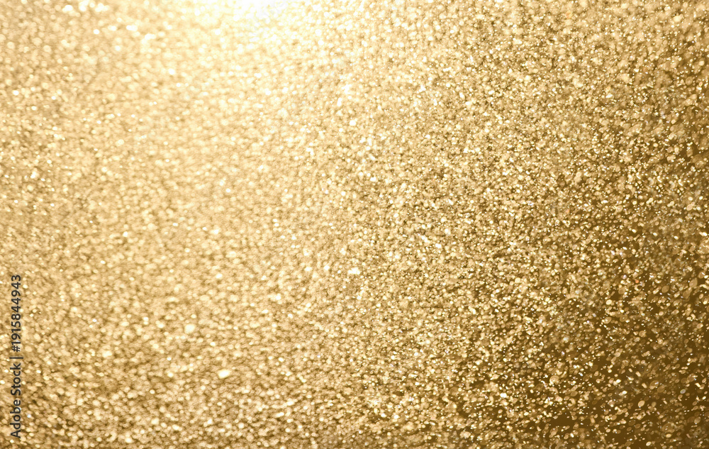 Close-up of shimmering golden water droplets suspended midair, illuminated by warm light, creating a sparkling bokeh texture across the entire frame. #1915844943