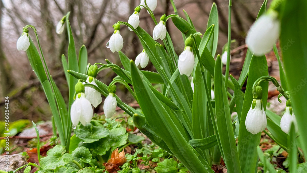 Close-up of snowdrop flowers with rain droplets in nature. #1966054424