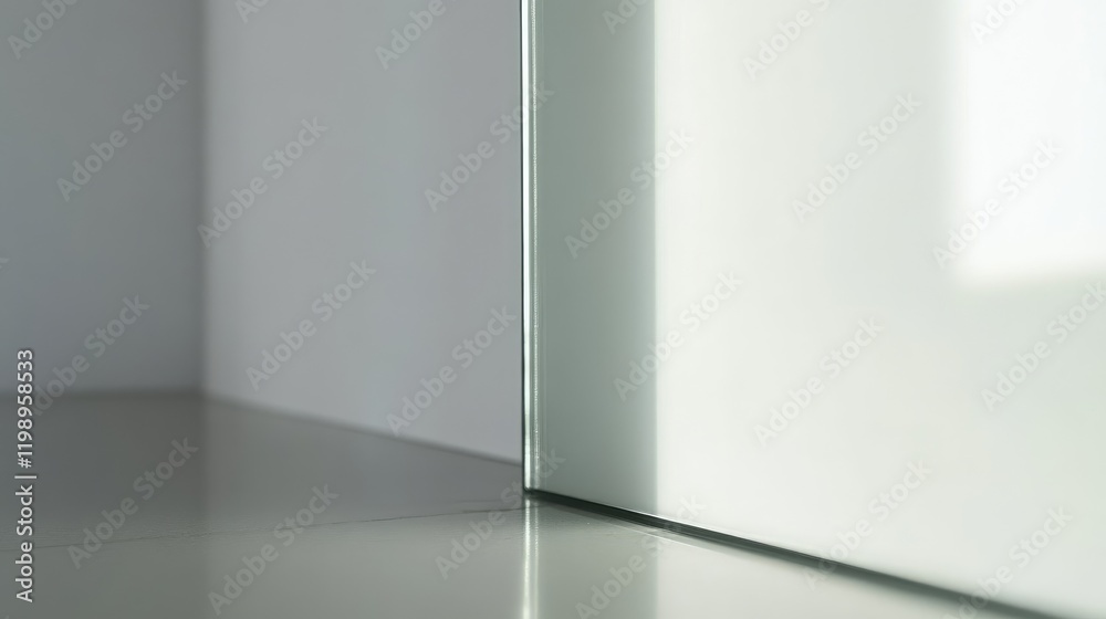 Close up of transparent glass wall corner with soft shadows and minimalistic white background featuring ample negative space for text placement #1198958533