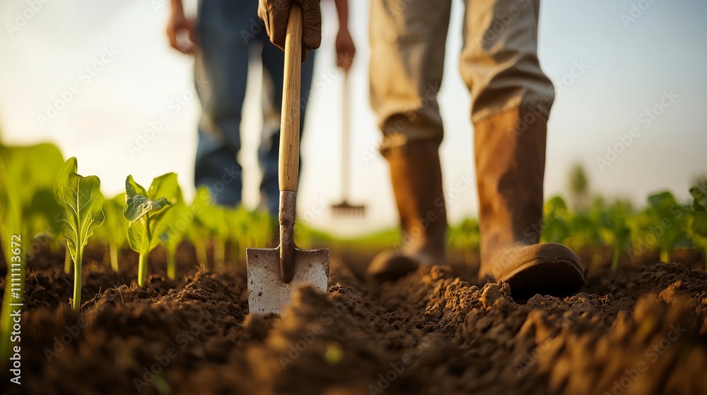 Close up of unrecognizable farmers working in field with shovel and rake at sunset #1111113672