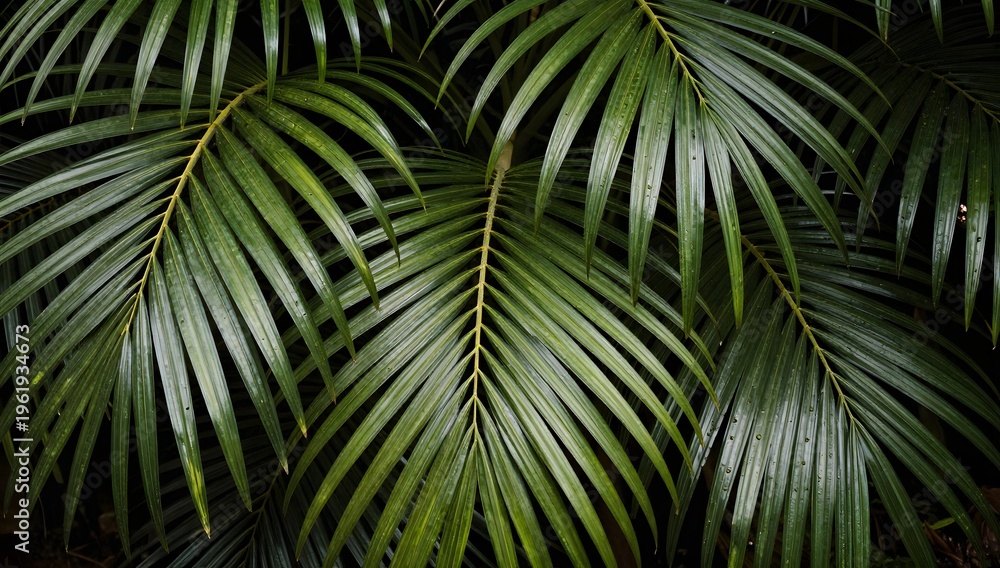 Close up of vibrant green palm leaves creating an intricate pattern against a dark background #1961934673