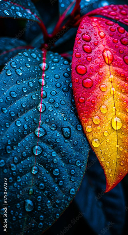 Close up of vibrant leaves covered in water droplets, showcasing the beauty of nature and the freshness of rain #1790797273