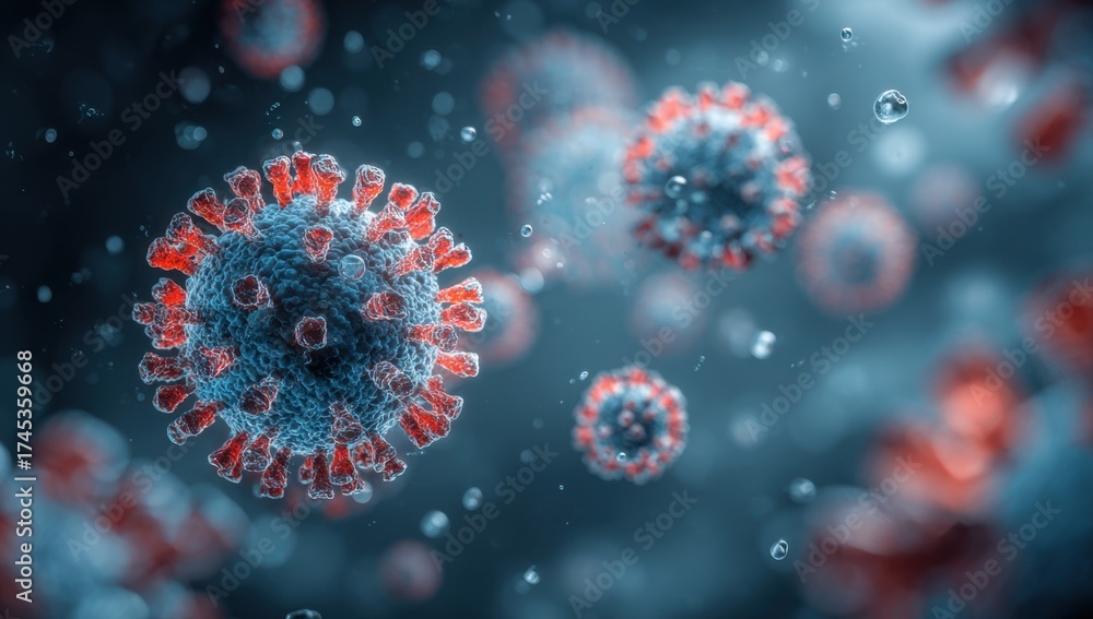 Close-up of virus particles floating in a microscopic environment with detailed structure #1745359668