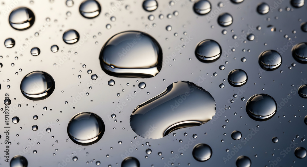 Close-up of Water Droplets on a Smooth Surface with Reflections. #1919791389