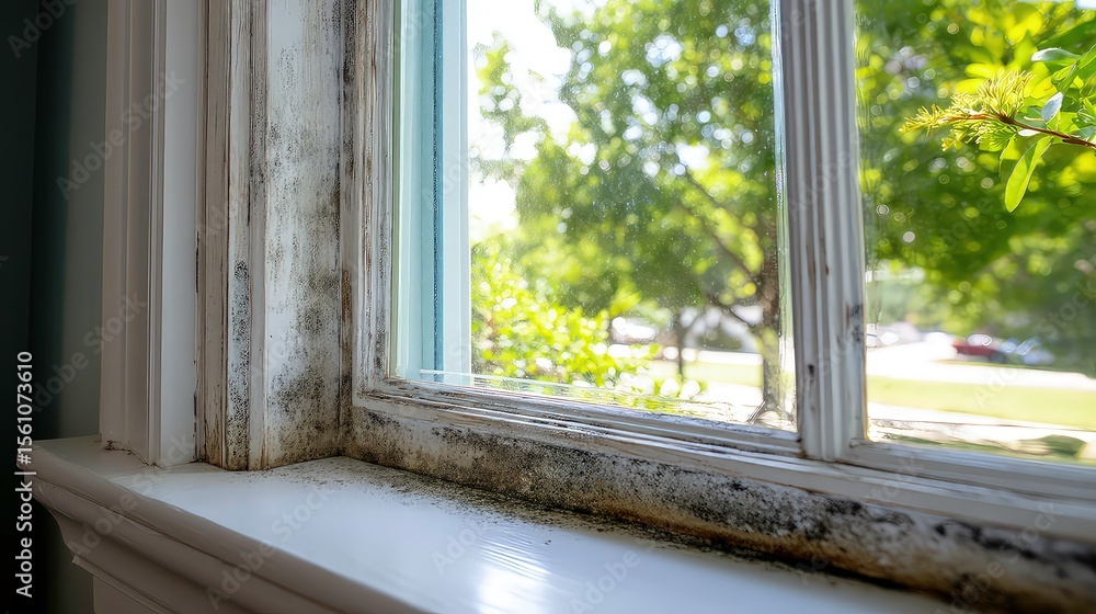 Close-up of window frame with black and green mold growth caused by moisture and poor ventilation in home interior with natural light exposure #1561073610