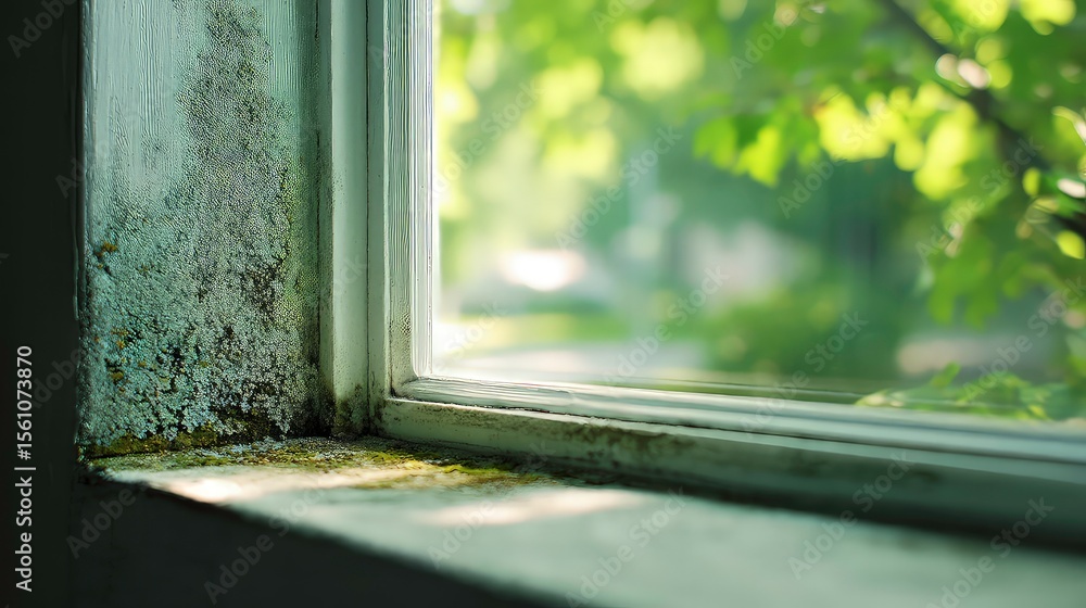 Close-up of window frame with black and green mold growth caused by moisture and poor ventilation in home interior with natural light exposure #1561073870