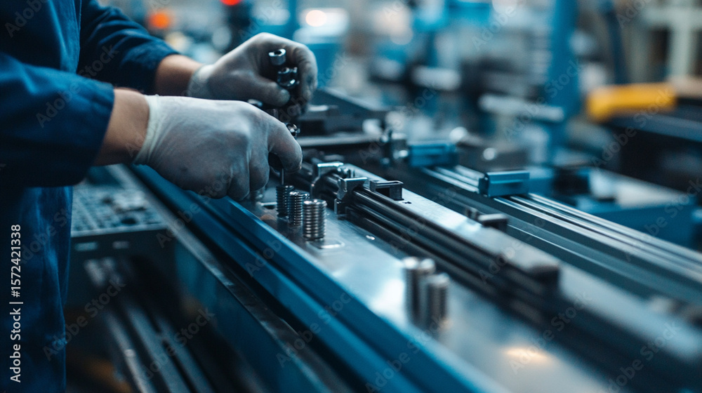 Close-up of worker attaching screws to metal housing on production line #1572421338