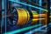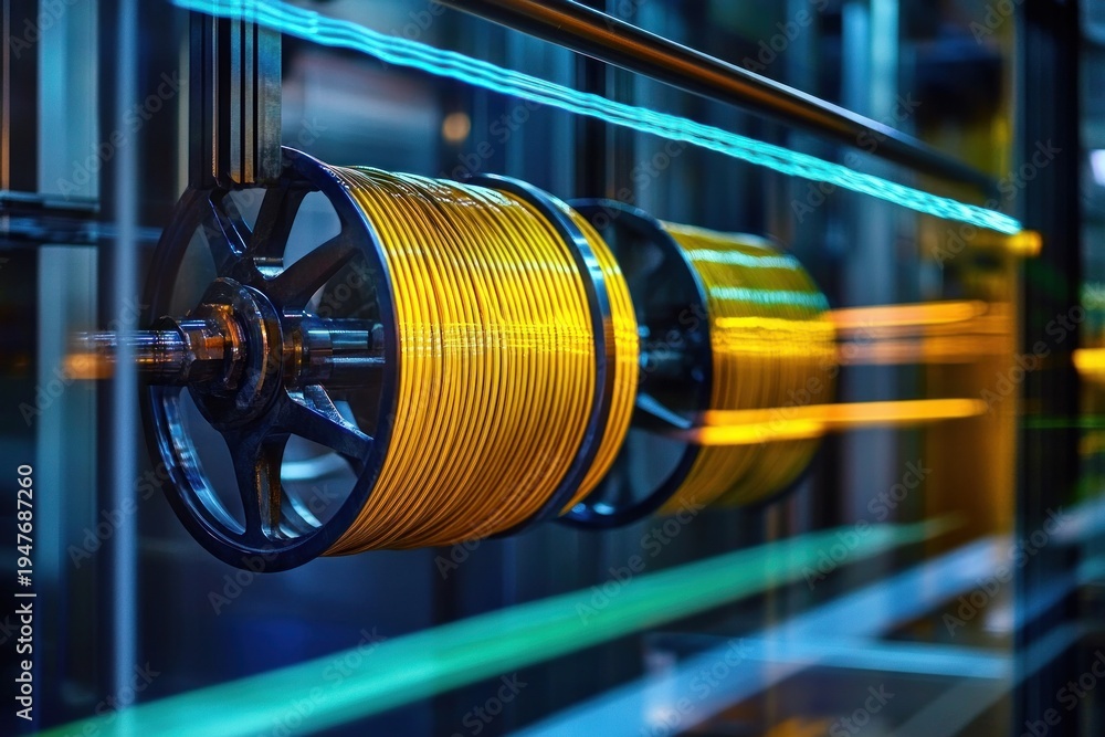 close-up of yellow wire spools on rotating metal reels in a high-tech factory with neon blue and green light trails conveying dynamic motion and precision #1947687260