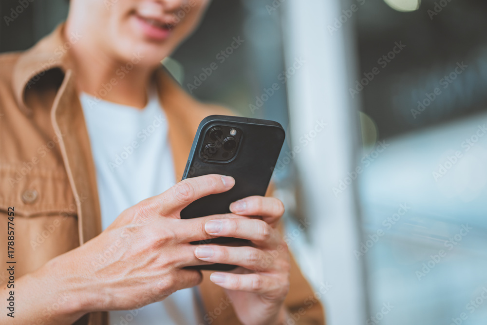 Close up of young man using smartphone, male hands holding mobile phone while texting or browsing online, modern digital lifestyle concept with communication technology and casual outfit in urban sett #1788577452