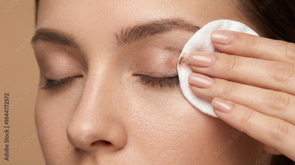 Close up of young woman removing eye makeup with cotton pad on beige background, skincare and cleansing routine concept #1844772572