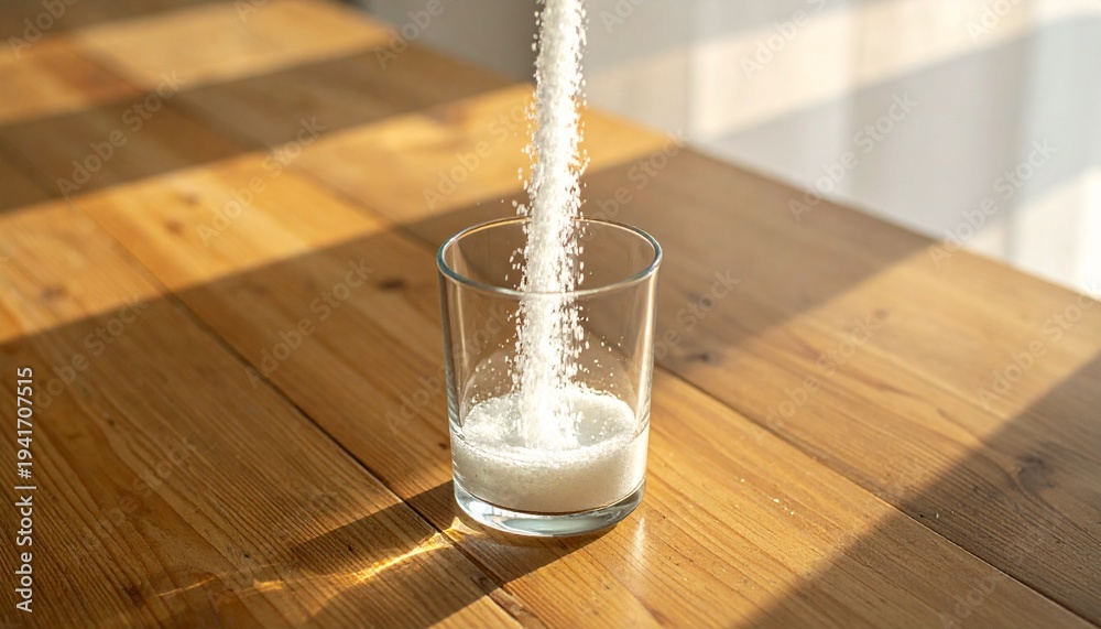 close up on Pouring white sugar in a glass of water on table #1941707515