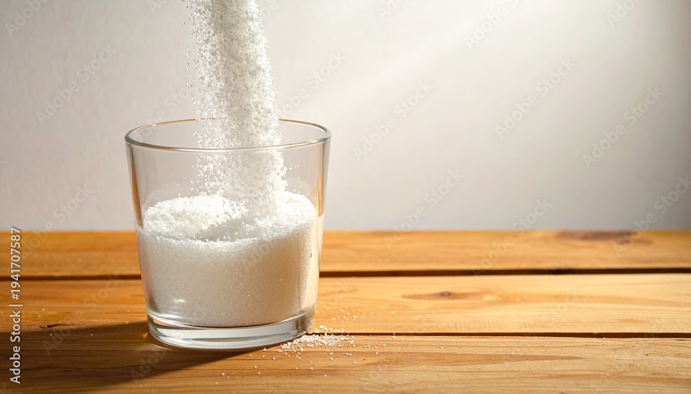 close up on Pouring white sugar in a glass of water on table #1941707587