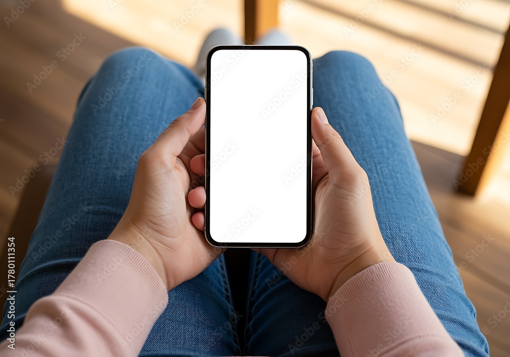Close up overhead shot of person in jeans holding smartphone with blank white screen mockup template vertical view #1780111354