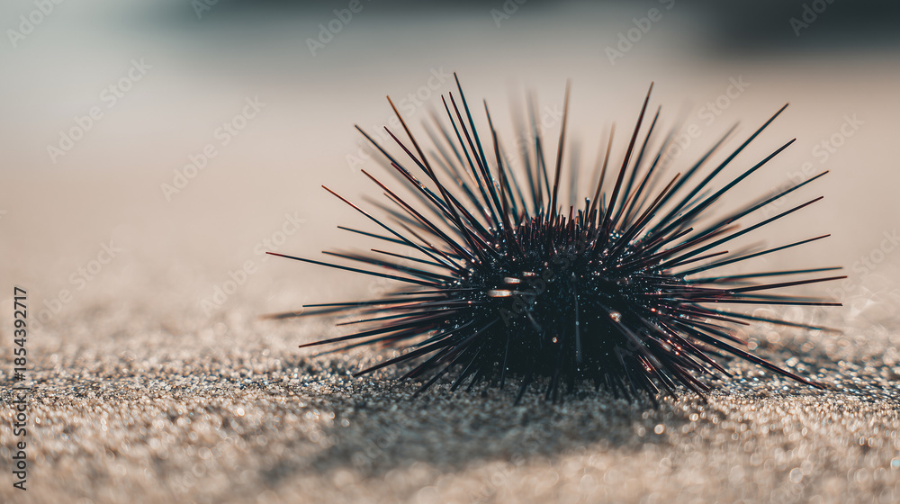 Close up photo of a single dark sea urchin resting on the beach edge, showing sharp spines and natural marine texture in a minimal coastal setting. #1854392717
