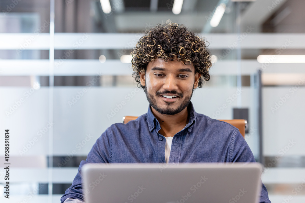 Close-up photo of a young Indian man smiling while working on a laptop in the office #1938591814