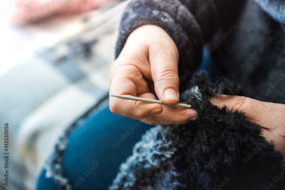 Close up photography of a knitting needle. Woman hands knitting a scarf. #312533056