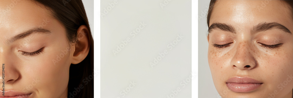 Close-up portrait mockup of two women with and without freckles, natural beauty and skin texture #1287294076