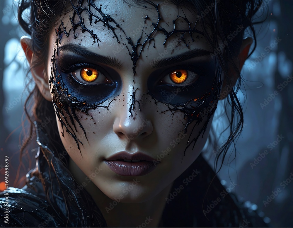 Close-up portrait of a woman with dramatic, dark makeup and glowing eyes #1692698797