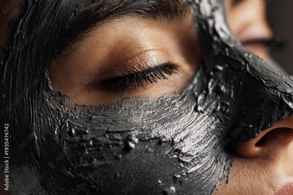 close-up portrait of woman with partially applied charcoal face mask during professional treatment, realistic skin texture contrast, soft spa lighting #1935476742