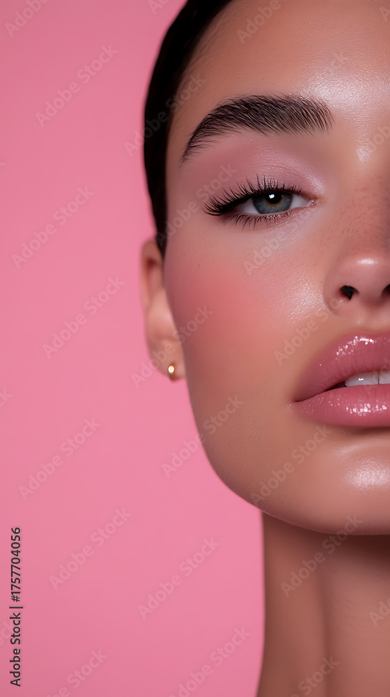 Close-up portrait showcasing the beauty of a woman with a pink makeup look and glossy lips, set against a vibrant pink background, highlighting her complexion. #1757704056