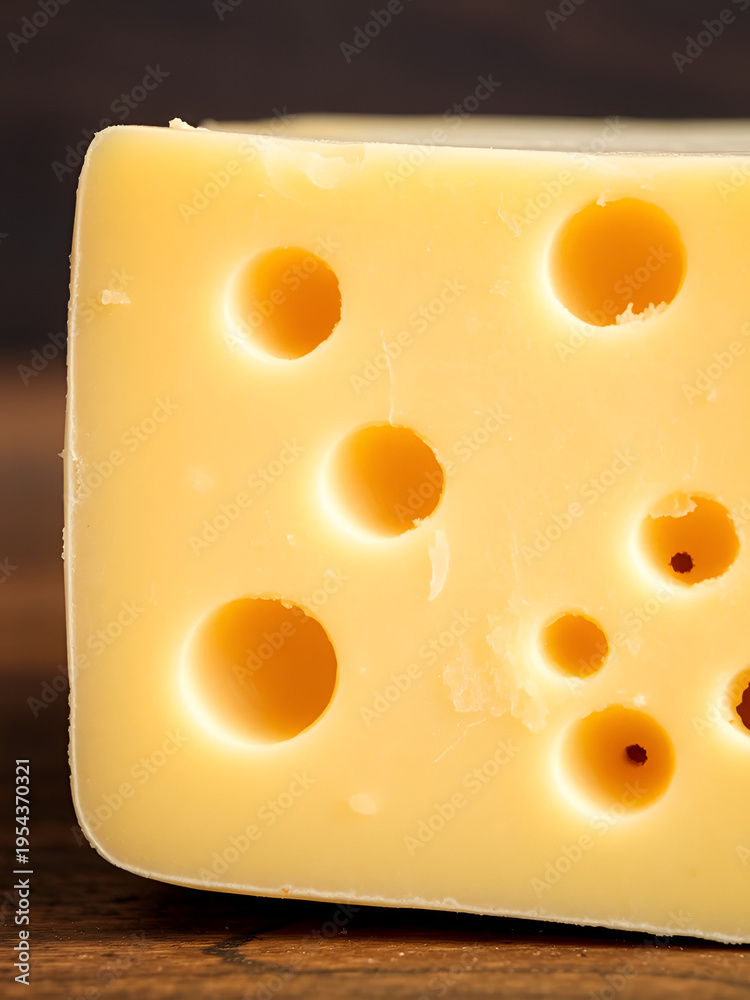 Close-Up View of a Block of Swiss Cheese with Air Holes and Texture #1954370321