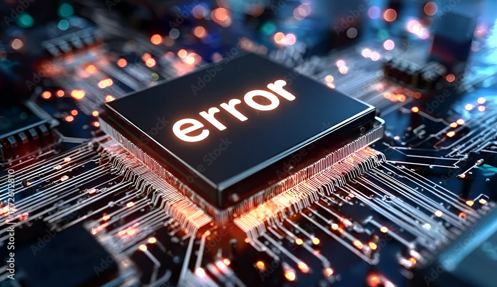 Close-up view of a computer chip displaying an error message, highlighting technology issues and electronic circuits. #1772612810