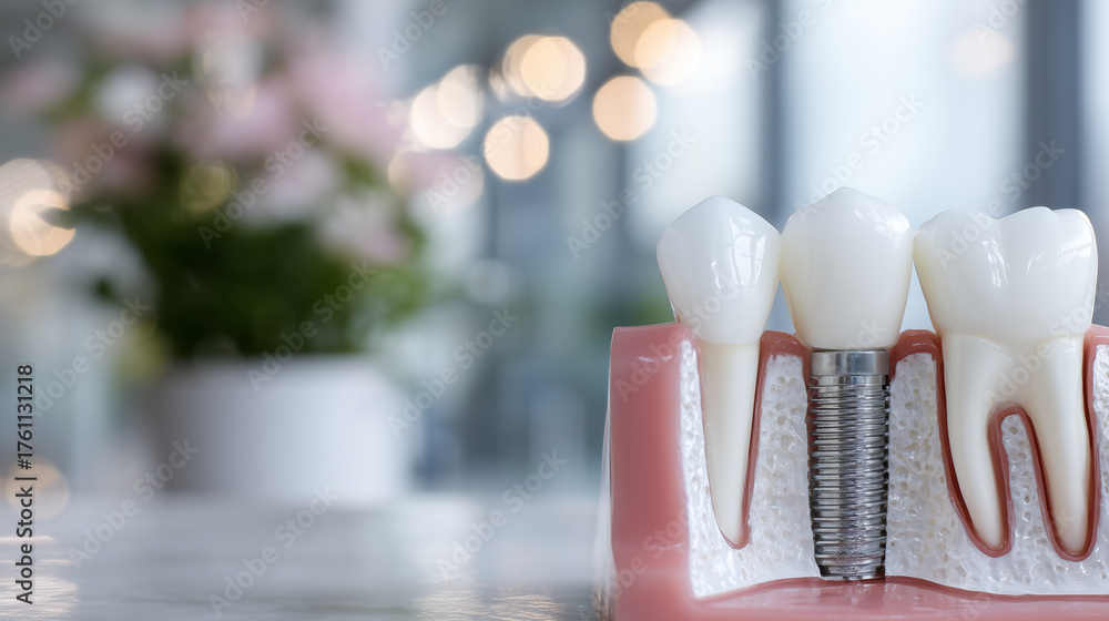 Close-up view of a dental implant model showing titanium post and ceramic crown fixed bridge, displayed on a pure white background with soft clinical lighting #1761131218