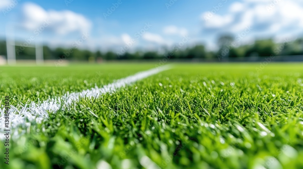 Close-up view of a vibrant artificial playing field, with a crisp white line. Sunny day, outdoors #1388441821
