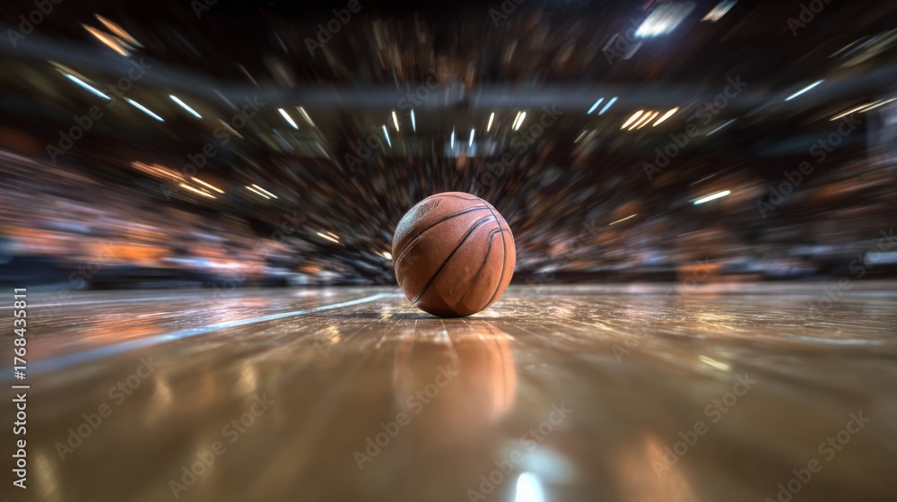 Close-Up View of Basketball on Court with Motion Blur in Background Displaying Dynamic Energy of Fast-Paced Game Action during Important Match #1768435811