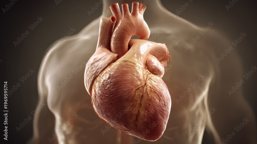 Close-up view of human heart inside torso showing anatomical structure and details #1969595714