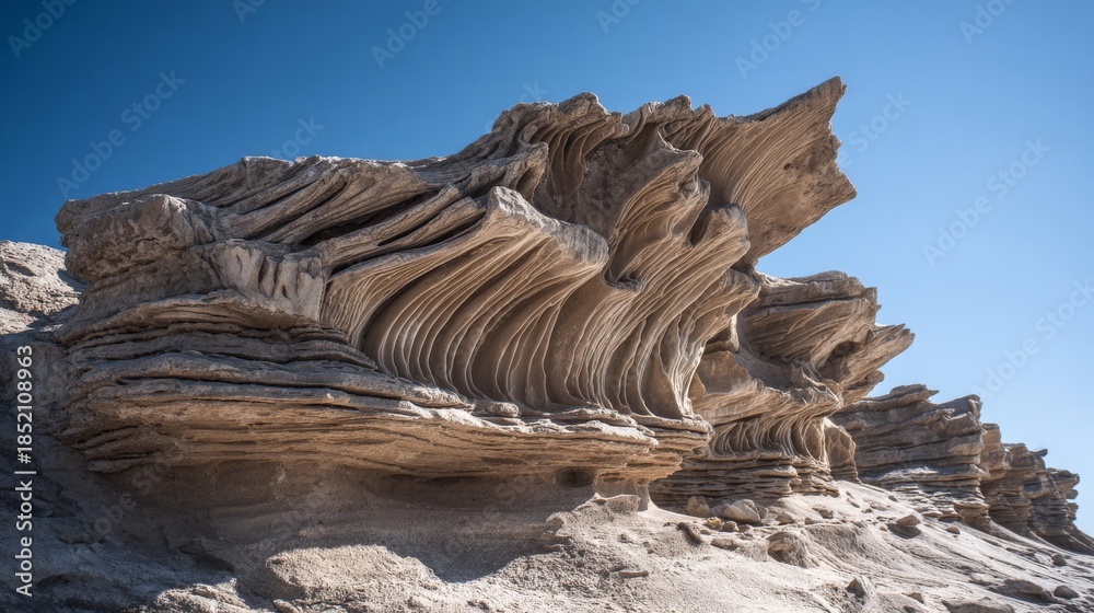 Close-up view of layered sedimentary rock formation with varied textures and colors, showcasing geological stratification and erosion patterns #1852108963