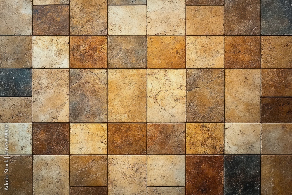 Close-up view of multicolored rustic ceramic wall tiles with shades of brown, beige, and gray arranged in a grid pattern #1675678917