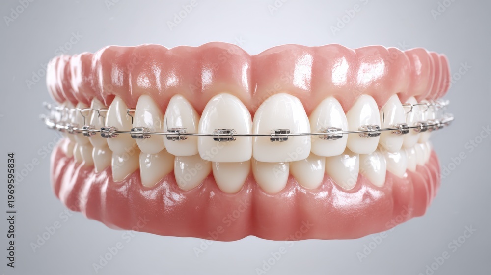 Close-up view of teeth with braces showing detailed orthodontic brackets and natural gum color #1969595834