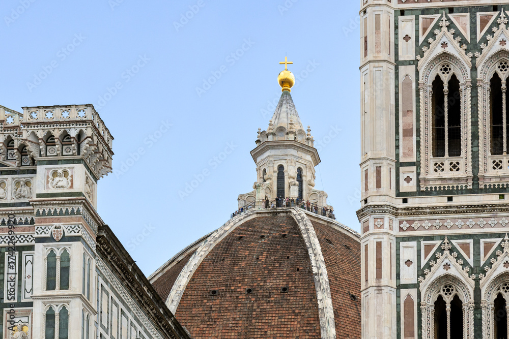 Close-up view of the dome of Florence Cathedral, designed by Brunelleschi, with Giotto Bell Tower and part of the cathedral facade in Florence, Italy #1742269920