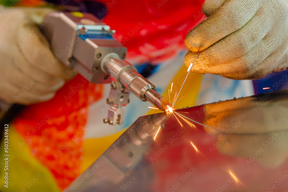 Close up: welder hands using portable handheld laser welding machine with sparks. Manufacturing, industrial, equipment, technology and metalworking concept #503349612