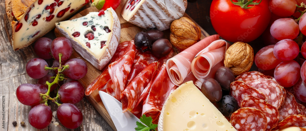 Close up wooden board with artisan meats, cheeses and fruits #1407216278