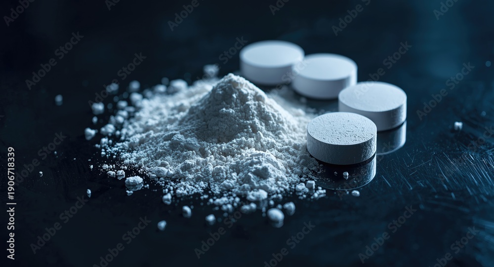 Close view of powdered fentanyl and white tablets on shiny reflective background depicting addiction theme #1906718339