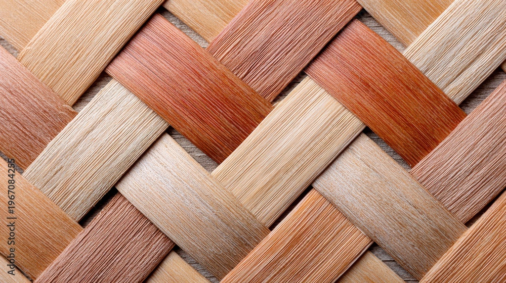 Close view of woven bamboo texture featuring an intricate pattern with variations in light orange and tan tones showing natural material details #1967084255