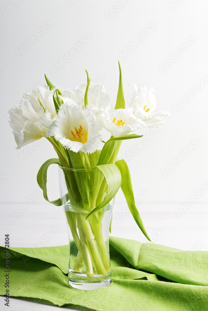 Closeup bouquet of White tulips with fringe in a transparent glass vase #1956272804