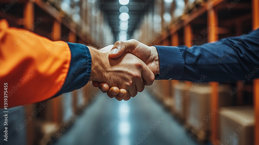 Closeup handshake between workers in orange and blue uniforms in warehouse #1319375455
