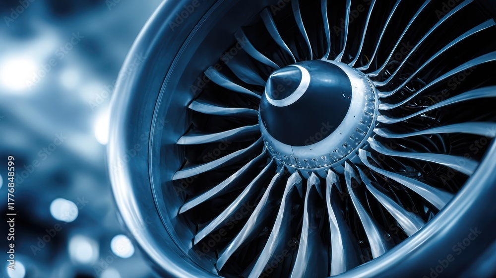 Closeup of a modern aircraft engine showcasing noisereducing baffles with sharp focus on structures and blurred background emphasizing innovative sound dampening technology. #1776848599