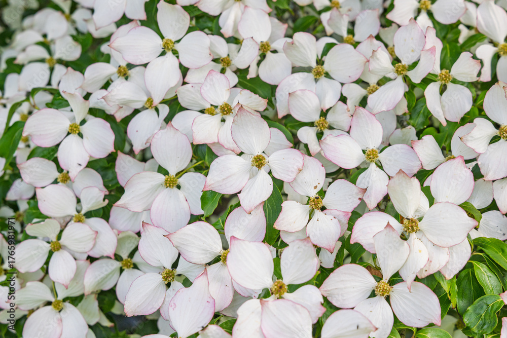 Closeup of beautiful Japanese dogwood (Cornus kousa) tree in botanical garden of Upper Brittany in Le Chatellier in France #1765981971