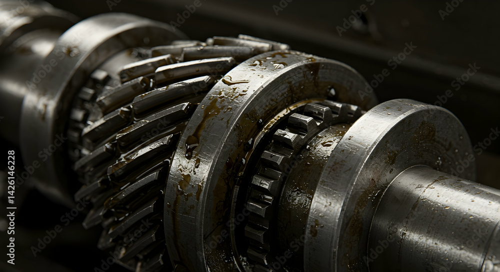 Closeup of greasy gears and shafts in an industrial machine transmission showcasing engineering and mechanics #1426146228