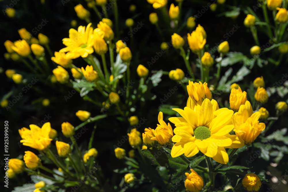 Closeup of greenhearted yellow chrysanthemums in sunlight. #1925399050