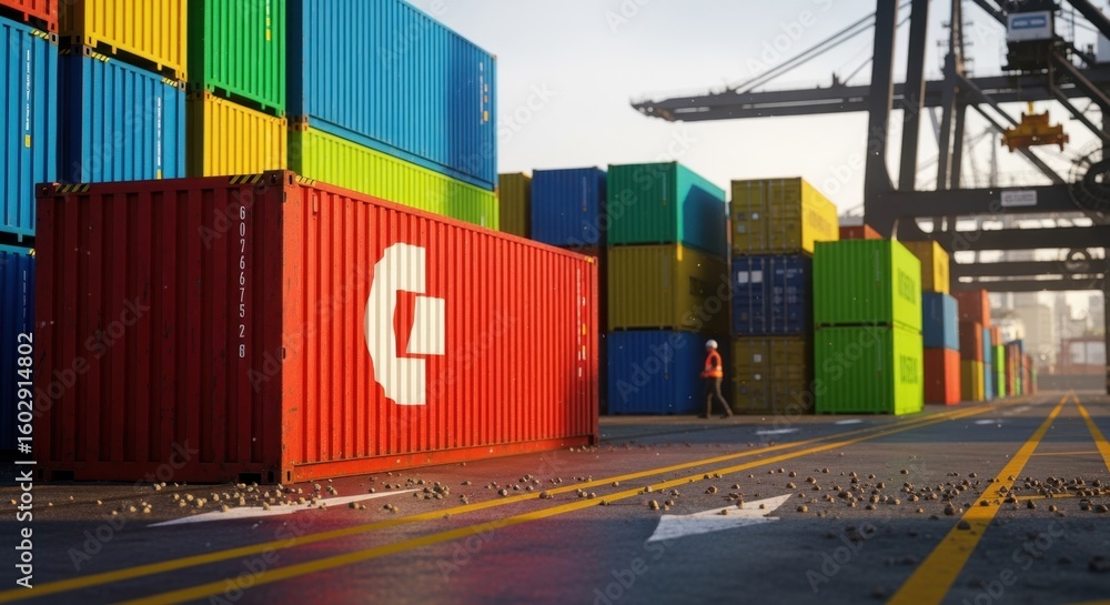 Closeup of vibrant intermodal containers neatly arranged on dock ground highlighting logistics operations. #1602914802