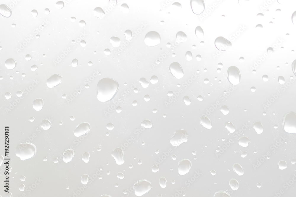 Closeup of water drops on transparent surface with blurred cloudy background. Natural moisture and rainy texture concept. #1927230101