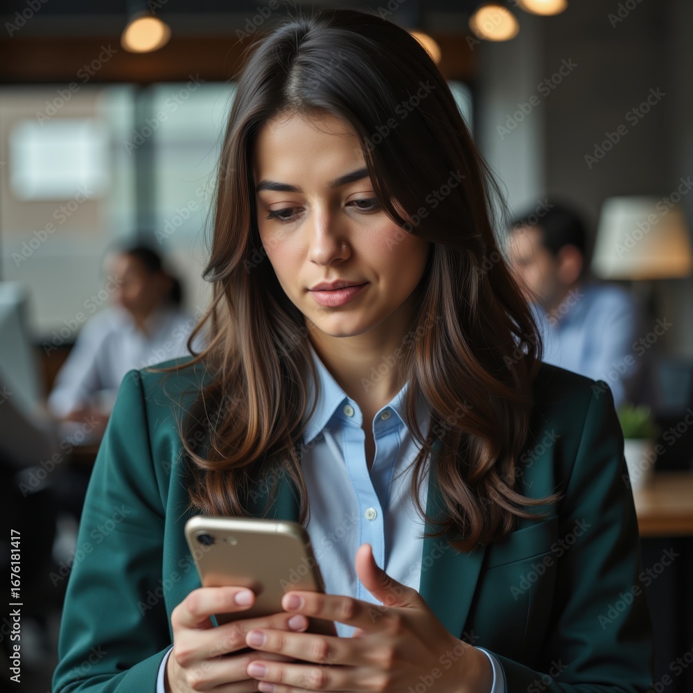 Closeup portrait of young dreaming indian business woman manager ceo using cell phone mobile app pondering latin hispanic female businesswoman holding smartphone in office for trading working online #1676181417