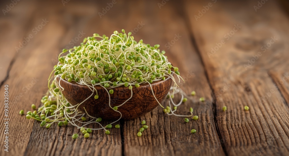 Closeup shot of a wooden bowl filled with healthy alfalfa sprouts on a natural timber surface #1938325040